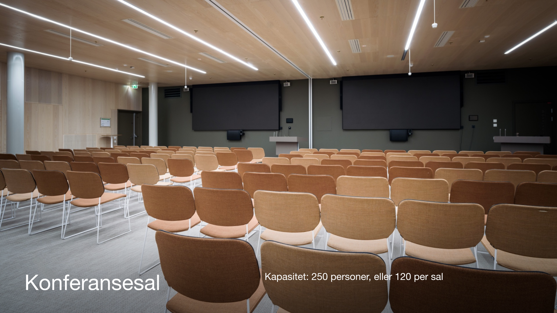 Vår store konferansesal med plass til 240 personer kan brukes til kurs, foredrag, møter for hele bedriften eller et festarrangement. Salen har eksklusivt serveringsområde rett utenfor. Rommet er utstyrt med gode digitale løsninger med kamera og ekstra lydkilder, det er lagt til rette for gode digitale og fysiske møter. Rommet kan deles og opereres individuelt eller kombinert.